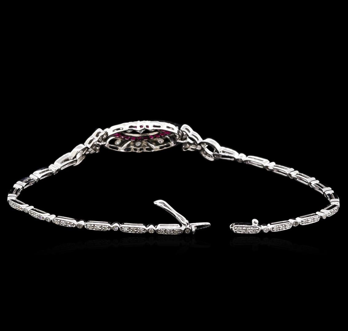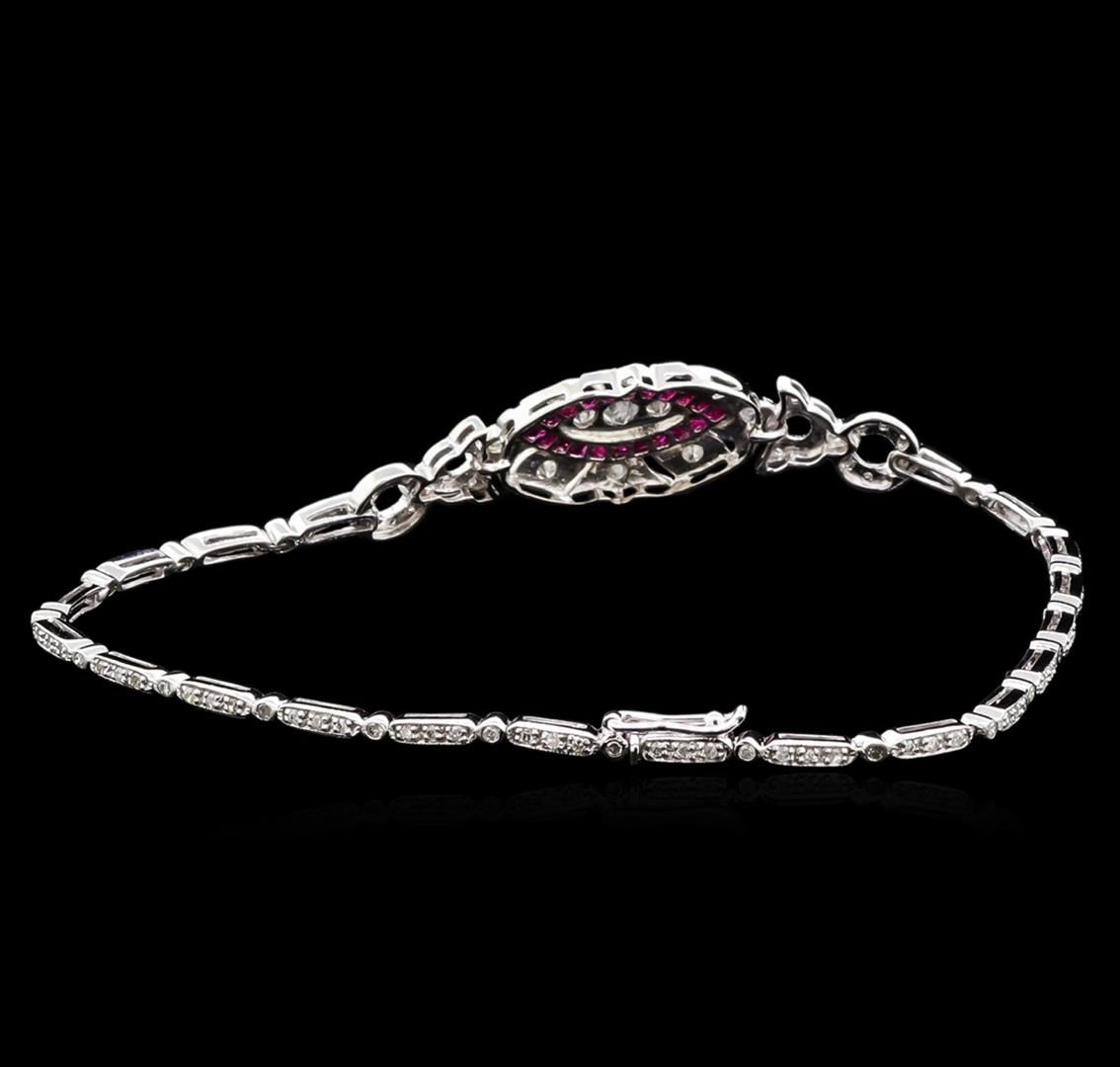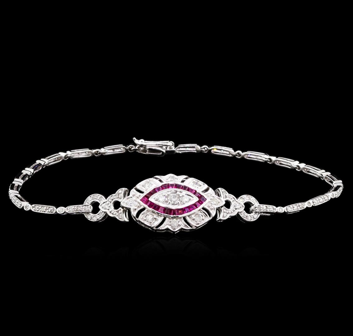 One electronically tested 18KT gold lady's combination cast & assembled vintage fashion bracelet with a tongue clasp with foldover safety with a bright polish with milgrain detailing finish. The featured lady's bracelet measures 7.5 inches in length Identified with markings of "18K". Condition is new, good workmanship. Containing: Twenty channel set square standard step cut natural rubies, measuring 1.80 x 1.70 x 1.60mm, approximate total weight of 0.98ct., clarity is eye clean, type II, medium, moderately strong, red color, (GIA R 5/4), cut is good. Colored gemstones are presumed to have been subjected to commonly used enhancement processes. Graded in the setting. One prong set round brilliant cut diamond, measuring 3.00 - 2.90 x 1.77mm (depth est.) approximate weight of 0.09ct. Graded in the setting. Clarity: I-1. Color: Very Good Ten prong set round brilliant cut diamonds, measuring 1.90 - 1.80 x 1.20mm (depth est.) approximate total weight of 10 Stones = 0.25ct. Graded in the setting. Clarity: SI-1 to SI-2. Color: H - I. Cut Good Ninety-Eight prong set round brilliant cut diamonds, measuring 1.30 - 1.00 x 0.71mm (depth est.) approximate total weight of 98 Stones = 0.58ct. Graded in the setting. Clarity: SI-2 to I-1. Color: G - I. Cut Good. Total Weight of Colored Stones 0.98ct. Total Weight of Diamonds 0.92ct. Total Weight of Bracelet 7.80gm. GAS Appraised at $5,615.00.