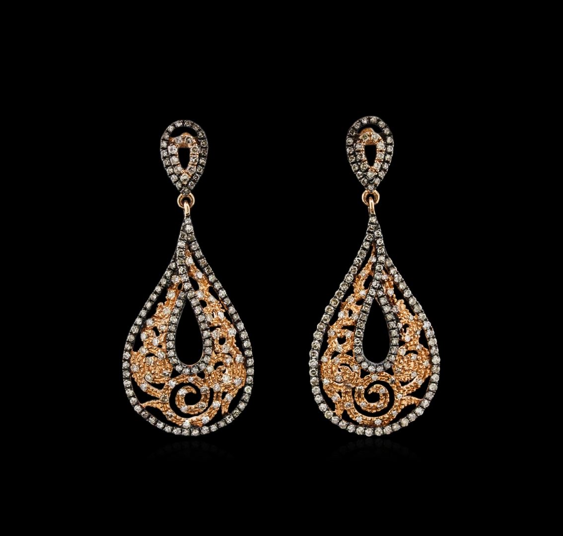 One pair of dangle earrings featuring: 14KT rose gold weighing 3.80 grams containing white and brown diamonds with a total weight of 0.98ct.