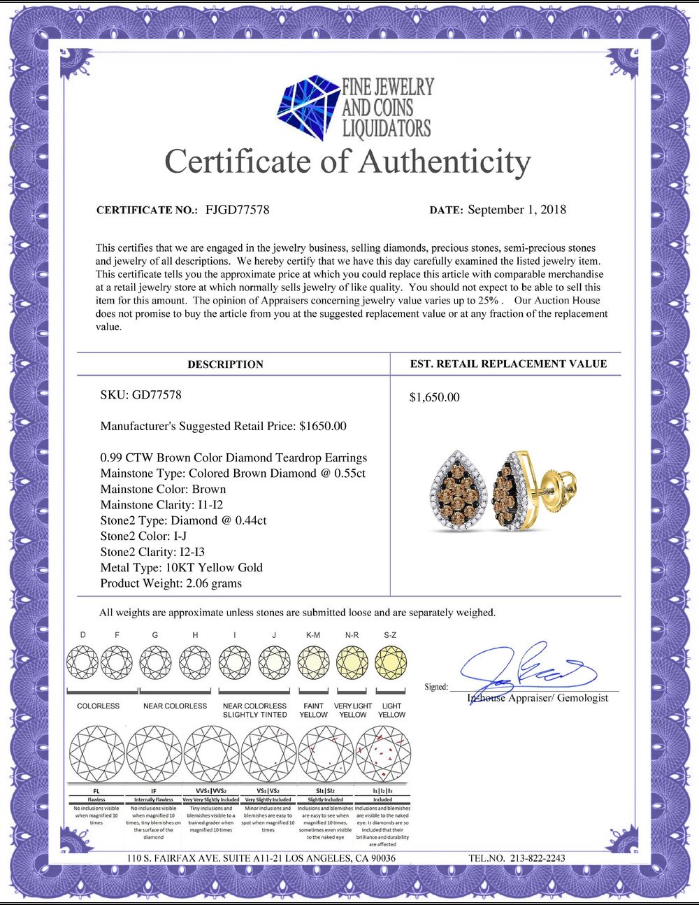REF-41N9F- SKU: GD77578 ---- 0.99 CTW Brown Color Diamond Teardrop Cluster Earrings 10KT Yellow Gold