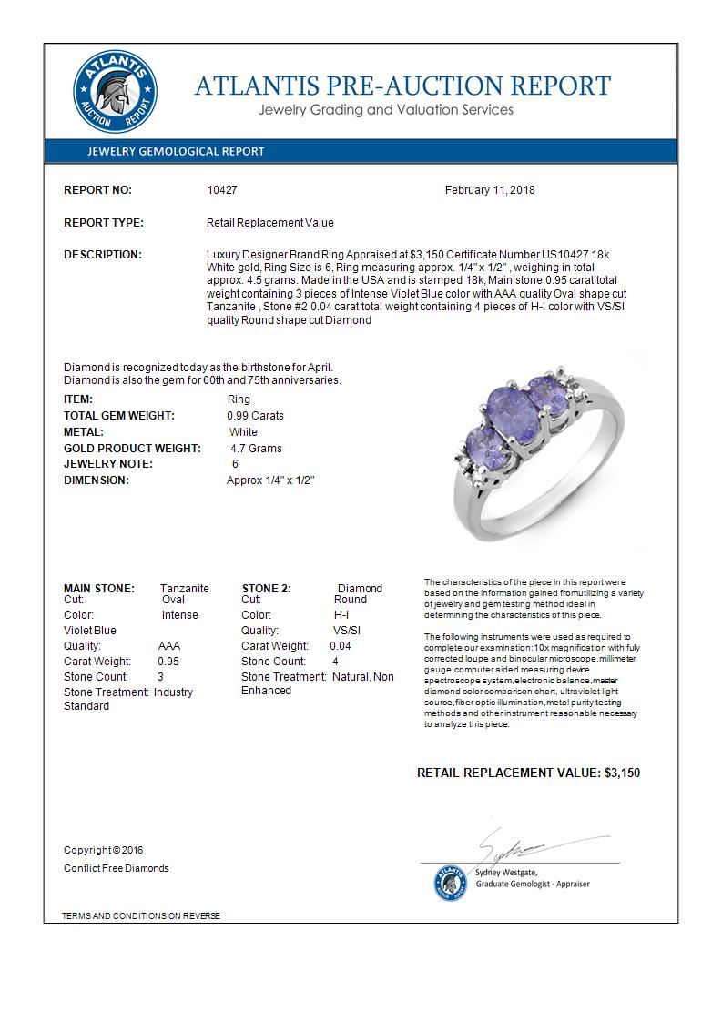 REF-44W2F -10427 ---- 0.99 CTW Tanzanite & Diamond Ring 18K White Gold ---- Luxury Designer Brand Ring Appraised at $3,150 Certificate Number US10427 18k White gold, Ring Size is 6, Ring measuring approx. 1/4" x 1/2" , weighing in total approx. 4.5 grams. Made in the USA and is stamped 18k, Main stone 0.95 carat total weight containing 3 pieces of Intense Violet Blue color with AAA quality Oval shape cut Tanzanite , Stone #2 0.04 carat total weight containing 4 pieces of H-I color with VS/SI quality Round shape cut Diamond