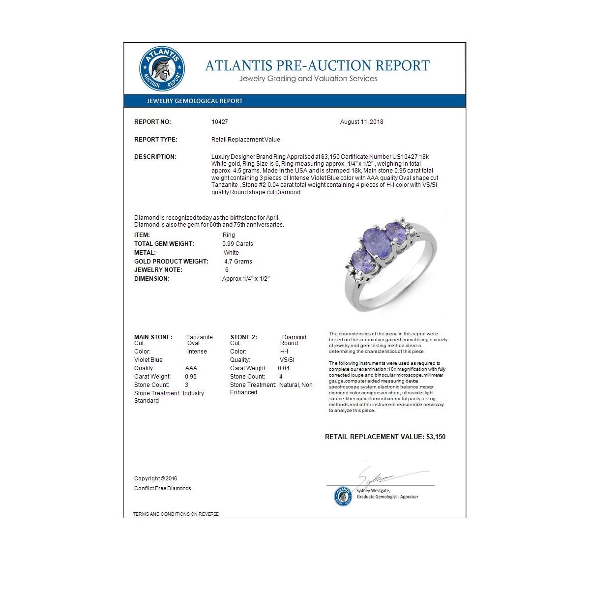 REF-44W2F -10427 ---- 0.99 CTW Tanzanite & Diamond Ring 18K White Gold ---- Luxury Designer Brand Ring Appraised at $3,150 Certificate Number US10427 18k White gold, Ring Size is 6, Ring measuring approx. 1/4" x 1/2" , weighing in total approx. 4.5 grams. Made in the USA and is stamped 18k, Main stone 0.95 carat total weight containing 3 pieces of Intense Violet Blue color with AAA quality Oval shape cut Tanzanite , Stone #2 0.04 carat total weight containing 4 pieces of H-I color with VS/SI quality Round shape cut Diamond