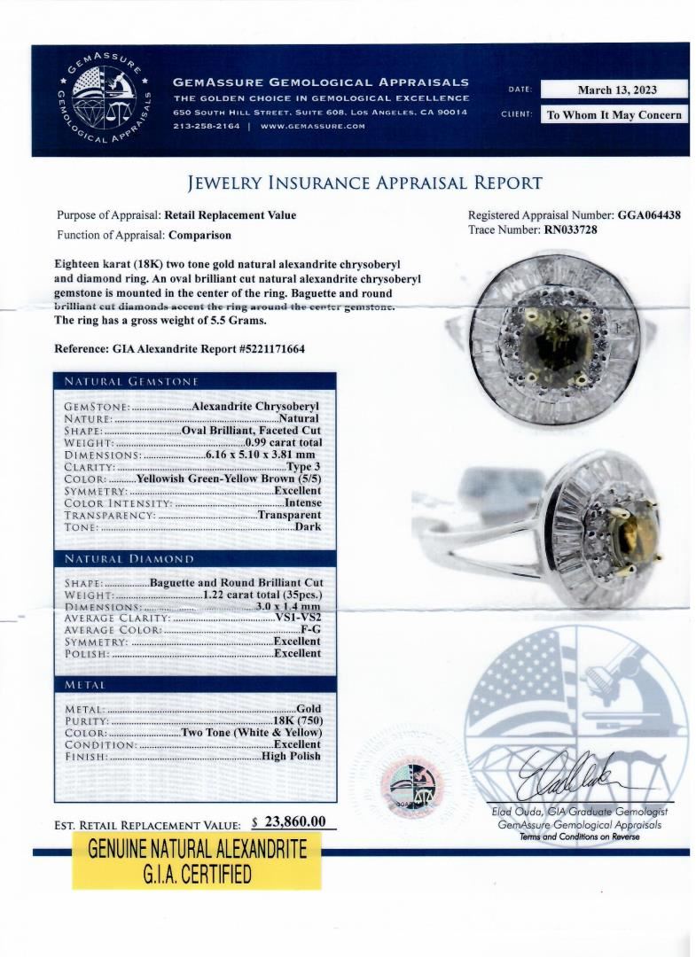 Eighteen karat (18K) two tone gold natural alexandrite chrysoberyl and diamond ring. An oval brilliant cut natural alexandrite chrysoberyl gemstone is mounted in the center of the ring. Baguette and round brilliant cut diamonds accent the ring around the center gemstone. The ring has a gross weight of 5.5 Grams. Reference: GIA Alexandrite Report 5221171664 #NATURAL GEMSTONE# GEMSTONE: Alexandrite Chrysoberyl NATURE: Natural SHAPE: Oval Brilliant, Faceted Cut WEIGHT: 0.99 carat total DIMENSIONS: 6.16 x 5.10 x 3.81mm CLARITY: Type 3 COLOR: Yellowish Green-Yellow Brown (5/5) SYMMETRY: Excellent COLOR INTENSITY: Intense TRANSPARENCY: Transparent TONE: Dark #NATURAL DIAMOND# SHAPE: Baguette and Round Brilliant Cut WEIGHT: 1.22 carat total (35pcs.) DIMENSIONS: 3.0 x 1.4mm AVERAGE CLARITY: VS1-VS2 AVERAGE COLOR: F-G SYMMETRY: Excellent POLISH: Excellent #METAL# METAL: Gold PURITY: 18K (750) COLOR: Two Tone (White & Yellow) CONDITION: Excellent FINISH: High Polish Size: 6 3/4
