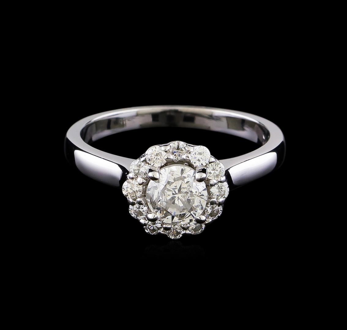 One electronically tested 14KT white gold lady's cast wedding ring with a basket halo with a bright polish finish. The featured lady's ring has a shank measuring 2.08 millimeters in width. Identified with markings of "14K". Condition is new, good workmanship. Containing: One prong set round brilliant cut diamond, measuring 5.46 - 5.44 x 3.38mm (depth est.) , 15.00.%. GTCF approximate weight of 0.72ct. Graded in the setting. Clarity: I-1. Color: Good Twelve prong set round brilliant cut diamonds, measuring 1.80 - 1.75 x 1.11mm (depth est.) approximate total weight of 12 Stones = 0.27ct. Graded in the setting. Clarity: SI-1 to SI-2. Color: H - I. Cut Good. Total Weight of Diamonds 0.99ct. Total Weight of Ring 3.50gm. GAS Appraised at $5,910.00.