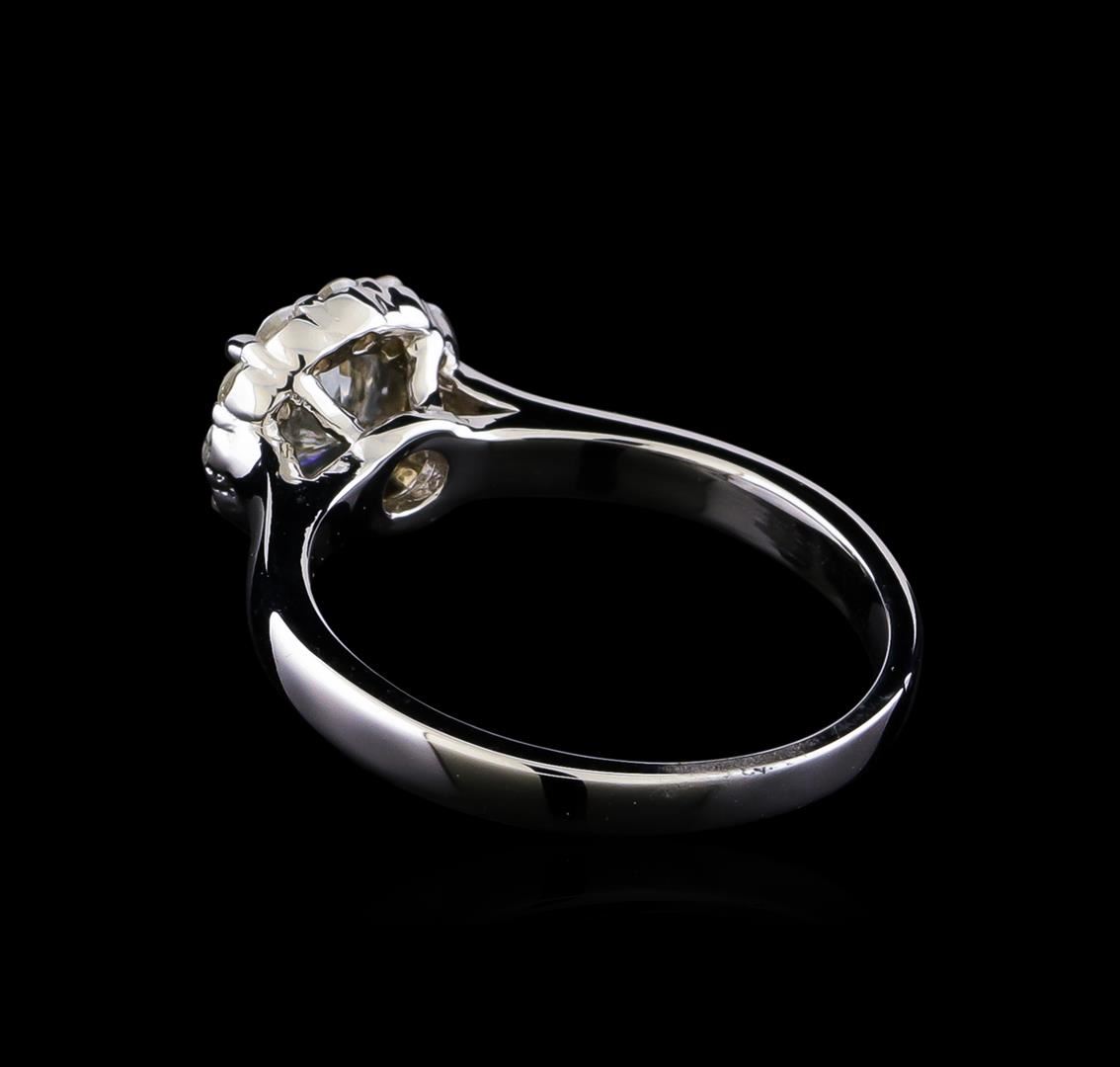 One electronically tested 14KT white gold lady's cast wedding ring with a basket halo with a bright polish finish. The featured lady's ring has a shank measuring 2.08 millimeters in width. Identified with markings of "14K". Condition is new, good workmanship. Containing: One prong set round brilliant cut diamond, measuring 5.46 - 5.44 x 3.38mm (depth est.) , 15.00.%. GTCF approximate weight of 0.72ct. Graded in the setting. Clarity: I-1. Color: Good Twelve prong set round brilliant cut diamonds, measuring 1.80 - 1.75 x 1.11mm (depth est.) approximate total weight of 12 Stones = 0.27ct. Graded in the setting. Clarity: SI-1 to SI-2. Color: H - I. Cut Good. Total Weight of Diamonds 0.99ct. Total Weight of Ring 3.50gm. GAS Appraised at $5,910.00.
