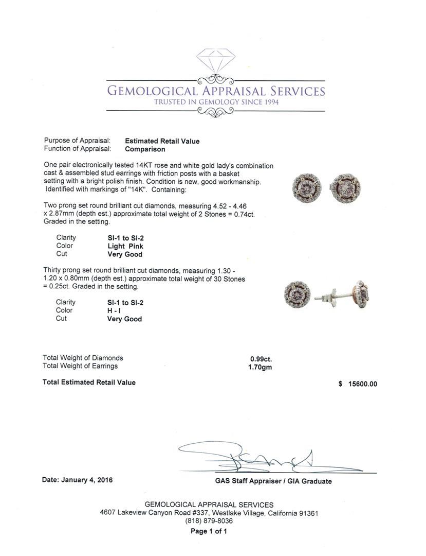 One pair electronically tested 14KT rose and white gold lady's combination cast & assembled stud earrings with friction posts with a basket setting with a bright polish finish. Identified with markings of "14K". Condition is new, good workmanship. Containing: Two prong set round brilliant cut diamonds, measuring 4.52 - 4.46 x 2.87mm (depth est.) approximate total weight of 2 Stones = 0.74ct. Graded in the setting. Clarity: SI-1 to SI-2 Cut Very Good Thirty prong set round brilliant cut diamonds, measuring 1.30 - 1.20 x 0.80mm (depth est.) approximate total weight of 30 Stones = 0.25ct. Graded in the setting. Clarity: SI-1 to SI-2. Color: H - I. Cut Very Good. Total Weight of Diamonds 0.99ct. Total Weight of Earrings 1.70gm. GAS Appraised at $15,600.00.