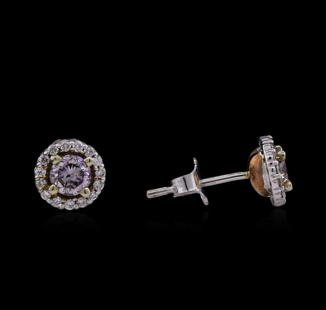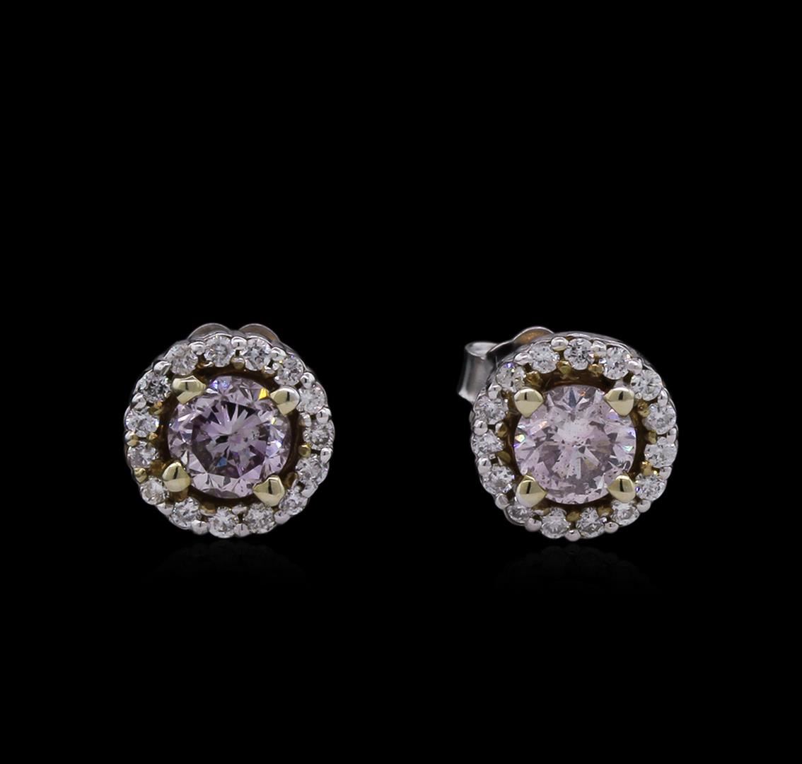 One pair electronically tested 14KT rose and white gold lady's combination cast & assembled stud earrings with friction posts with a basket setting with a bright polish finish. Identified with markings of "14K". Condition is new, good workmanship. Containing: Two prong set round brilliant cut diamonds, measuring 4.52 - 4.46 x 2.87mm (depth est.) approximate total weight of 2 Stones = 0.74ct. Graded in the setting. Clarity: SI-1 to SI-2 Cut Very Good Thirty prong set round brilliant cut diamonds, measuring 1.30 - 1.20 x 0.80mm (depth est.) approximate total weight of 30 Stones = 0.25ct. Graded in the setting. Clarity: SI-1 to SI-2. Color: H - I. Cut Very Good. Total Weight of Diamonds 0.99ct. Total Weight of Earrings 1.70gm. GAS Appraised at $15,600.00.