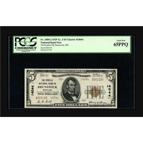 <B>Brunswick, MD</B></I> - $5 1929 Ty. 2 <B>The Peoples NB</B></I> Ch. # 14044<BR>A well centered note certified as <B>PCGS Gen New 65PPQ</B></I> and clearly deserving every point of that premium grade.<BR><I> From the George P. Hammerly Collection.</B></I><BR><BR><b>Shipping:</b> Coin/Currency (<a target="_blank" href="http://www.heritageauctions.com/common/shipping.php">view shipping information</a>)