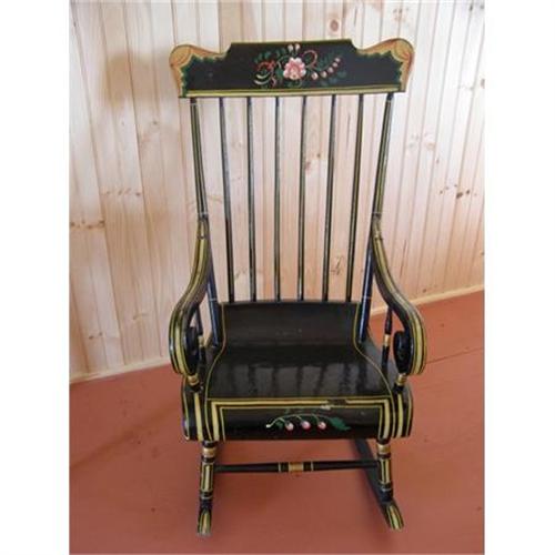 beautiful early 1900's hand painted Amish rocker. Spindle Back. Crestrail and seat have hand painted decorations. Seat is single board plank bottom molded with curve front lip. Simple baluster turned legs set into long oak runners. Tight with no loose joints. Black with red, green and gold decoration. Satin sheen.