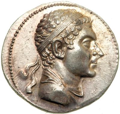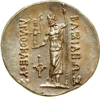 Bactria. Agathokles, c. 185-170 BC. AR Tetradrachm (16.94 g), Merv mint(?). Diademed and draped bust of Agathokles right. Reverse: Zeus standing, facing, scepter in left hand and holding in right hand a figure of triple-faced Hekate, who holds two torches; BASILEOS AGAThOKLEOU, monogram at lower left. Bopear. Série 1D; SNG ANS 230; MIG type 137a; MACW 1677; Rahman 148-149. Splendid sculptural high relief portrait, finely struck on nearly round flan of choice metal. The obverse a superb rendering of an assertive man with an almost ironic air. NGC graded Uncirculated.