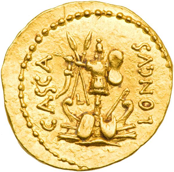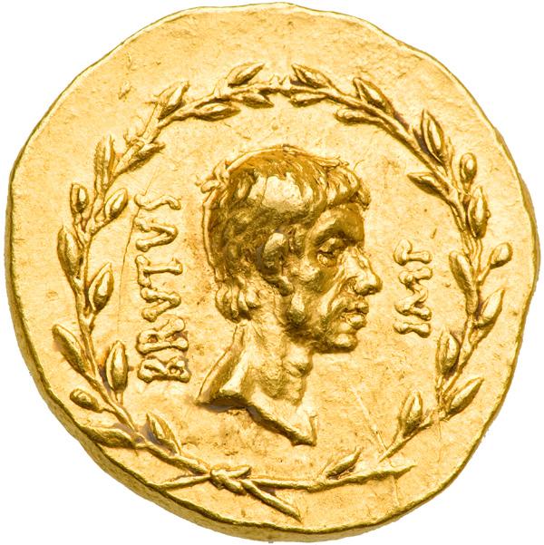 Marcus Junius Brutus, d. 42 BC. Gold Aureus (8.07 g), struck at a traveling mint in Macedonia or Western Asia Minor, summer/autumn 42 BC. With moneyer, P. Servilius Casca Longus. Bare head right of Brutus with short beard, BRVTVS IMP on either side, all within laurel wreath. Reverse: Combined military and naval trophies, with prows and shields at base; a small L to left of trophy; CASCA LONGVS on either side. Fr-24 (this coin); Craw 507/1b; BMCRR 62; Syd. 1297; Vagi 94; Kent-Hirmer 99. Faint double striking at back of head, otherwise a splendid likeness, in high relief. Lustrous and sharp! One of the most historic of Roman issues, gold or silver! Excessively rare. Probably the finest of only 8 recorded specimens. NGC graded Choice About Uncirculated. .