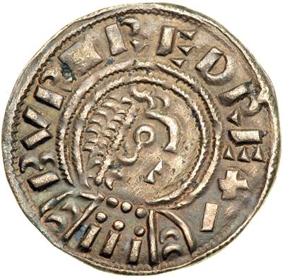 Great Britain. Kings of Mercia. AR Penny, ND. North-426; S-939. 1.36 grams. Burgred, 852-874 AD. Profile Portrait type. Schematic diademed draped bust right; BVRGRED REX -. Reverse: Inscription in lunette of three lines: MON ETA in upper and lower registers, divided by two single lines with hook-like ends; in central: + LIAFMA / N (on upper register). Finely centered, sharp strike on excellent metal. Even, medium neutral to brownish gray toning. Finely preserved, and rare as such. NGC graded AU-55.
