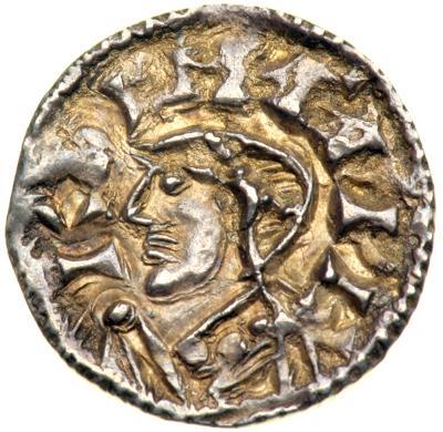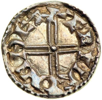 Great Britain. Kings of All England. AR Penny, ND (Thetford, struck 1048-1050). North-818; S-1175. 1,13 grams. Edward the Confessor, 1042-1066 AD. Short Cross type; small thick module. Moneyer, Aelfric. Diademed and draped bust left; +EDPE RE(C?) around. Reverse: Short voided cross, pellet at center; +ÆLFIC ON ÐET around. Sharp full strike, if a little doubled on obverse. Medium warm gray to deep golden brown toning. NGC graded MS-62.