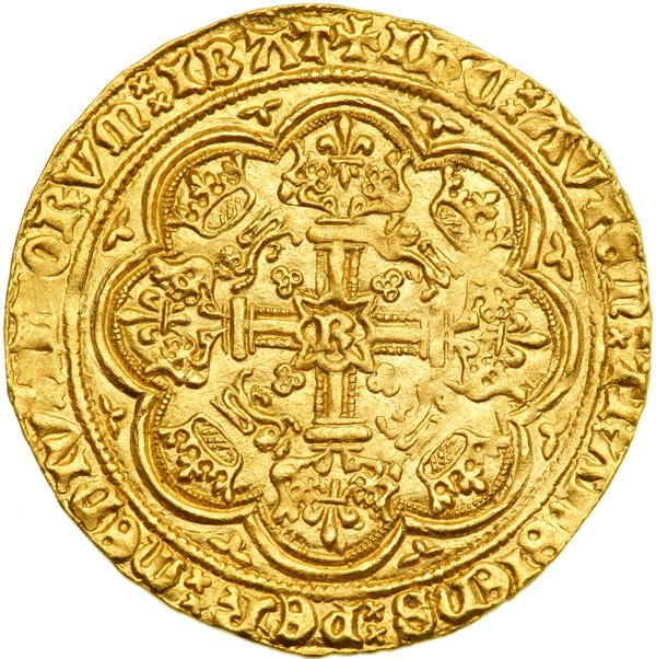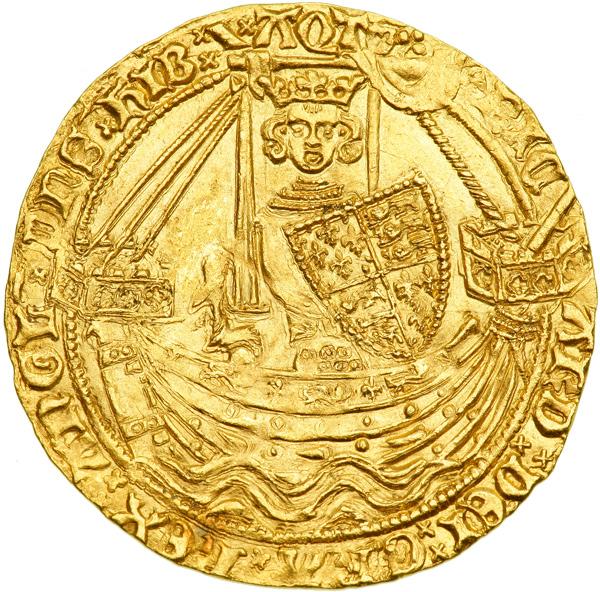 Great Britain. Noble, ND. S-1658; N-1304. 7.81 grams. Richard II, 1377-1399. London Mint. Henry IV Style-Coinage, with Aquitaine title. King stands facing in ship, bearing sword and shield, trefoil over sail. Reverse: Royal cross in tressure. Cross pattee mintmark (style of Edward III's Cross 4). An incredibly choice piece, lustrous with a crisp strike and a full flan, and remarkably with the king's face fully detailed! The finest Richard II noble this cataloguer has seen in nearly 30 years, and a coin of historical value as well as exceptional eye-appeal. NGC graded MS-64. .