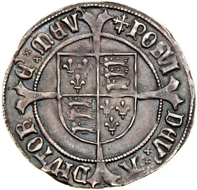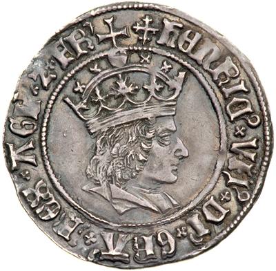 Great Britain. Groat, ND. S-2258; N-1747; SCBI-23 (Ashmolean), 789. 3.11 grams. Henry VII, 1485-1509. London mint (1504-1505). Regular issue. Crowned and draped bust right, crown with three bands. Reverse: Quartered shield bourne by cross fourchee. Cross-crosslet mintmark. Bold, even strike on a super flan, with fine deep old-collection toning. This coin with an extraordinary Tudor portrait and crisp legends. NGC graded AU-58.