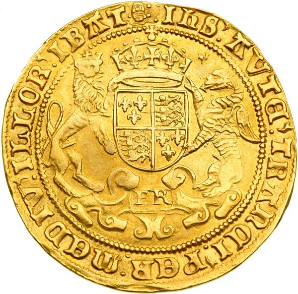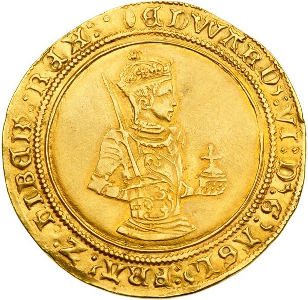 Great Britain. Sovereign of 20 Shillings, ND. S-2450. 10.71 grams. Edward VI, 1547-1553. Third Period (1551-1553). Crowned and armored half-figure right, holding sword and globus cruciger. Reverse: Crowned shield, with supporters. Tun mintmark. Well struck, with intricate details showing on the portrait. On a broad flan with full legends. An exceptionally choice EF. Very rare. NGC graded EF-40. .