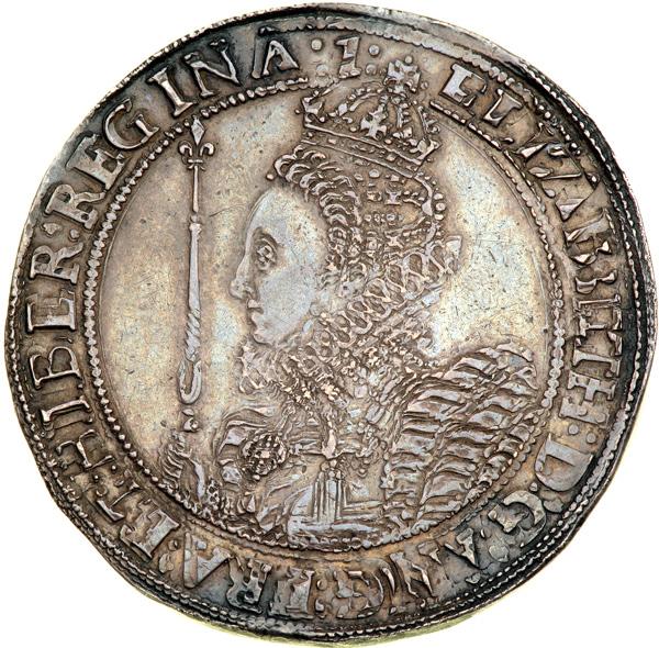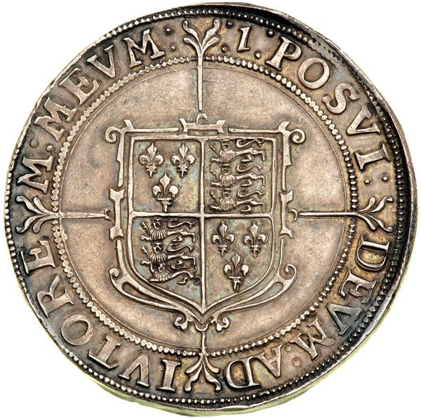 Great Britain.Crown, 1601. S-2582; Dav-3757. 29.54 grams. Elizabeth I, 1558-1603. Mintmark 1 (1601). Sixth Coinage. Crowned "old" bust left, with elaborate dress and fancy ruff, tightly coiffed hair; scepter points to "I" in REGINA. Reverse: Quartered shield upon cross fleury. Doubling to portions of obverse inscription and lower part of bust, otherwise an exceptionally bold and full strike for the hammered series, with a choice and detailed portrait. Very rare in this grade. Fine old gray toning with colorful hues. The first coinage of the new century! NGC graded MS-61.