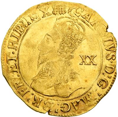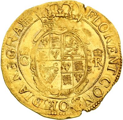 Great Britain. Tower Unite, ND. S-2692 (2693A); N-2152. 9.00 grams. Charles I, 1625-1649. Fifth Bust, in small lace collar; Tower mint under the King (1633-1634). High-crowned bust left. Reverse: Garnished oval shield, crown above. Portcullis mintmark. Superb grade for issue: essentially As Struck on the usual, wretched, irregularly shaped flan, the hand-striking qualities soft in areas. Scarce and as nice as this issue comes. NGC graded AU-55.
