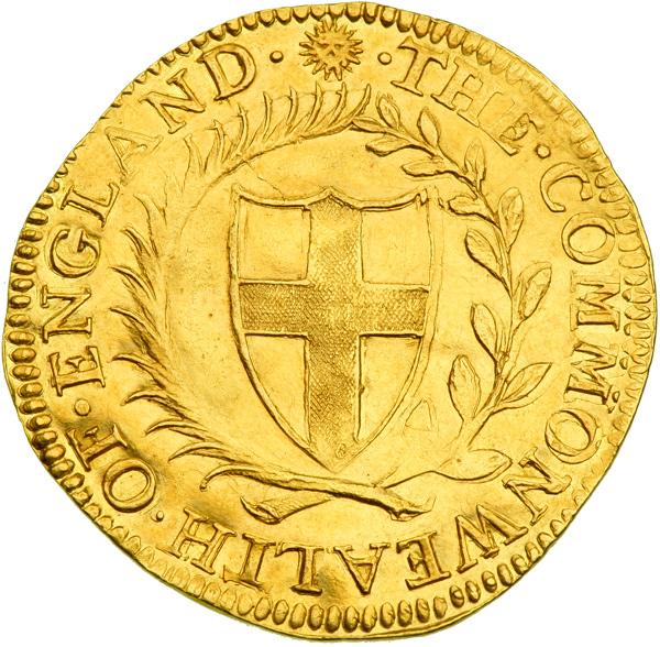 Great Britain. Unite of 20 Shillings, 1650. S-3208; Fr-269; SC-5. 9.04 grams. Commonwealth of England, 1649-1660. Shield of Saint George within wreath. Reverse: Shields of Saint George and Ireland; above, XX, value in Roman numerals. Sun mintmark. Well struck on a full, slightly oblong flan. Softly lustrous and beautiful. Certainly among the finest known and a rare, early date. NGC graded AU-58. .