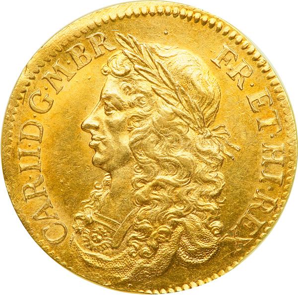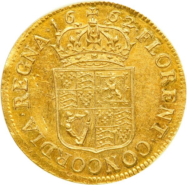 Great Britain. Gold Pattern Broad, or Guinea, 1662. North-2780; KM-Pn32. By Thomas Simon. Charles II, 1660-1685. Hammered Coinage. Laureate, cuirassed, and draped bust of Charles facing left. Reverse: Crowned square shield; around, legend: FLORENT CONCORDIA REGNA; date above. Plain edge. Rare. Virtually as struck, with lovely portrait and a highly lustrous obverse. Struck from a concave reverse die, producing somewhat "diminished" luster on reverse. In exceptional grade for this type. NGC graded MS-62. .
