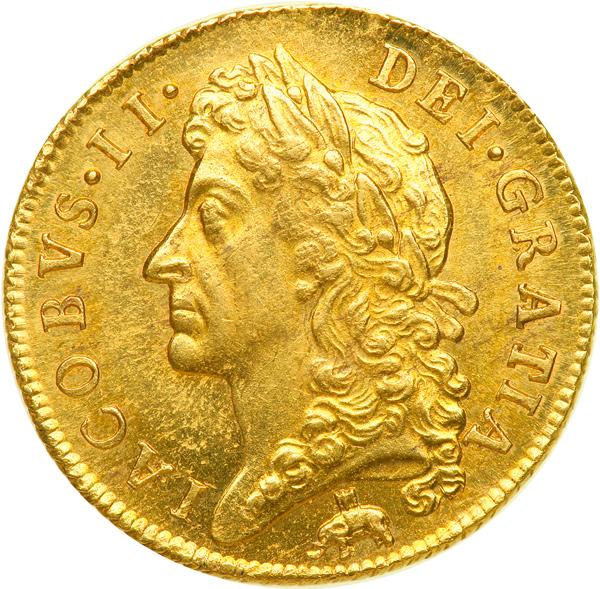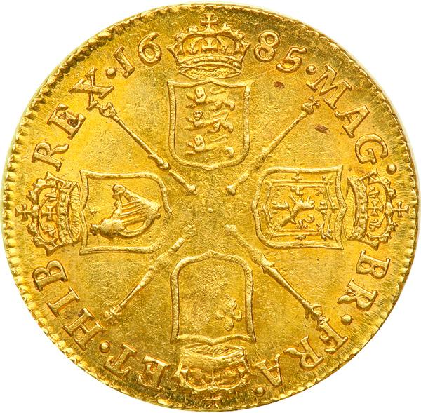 Great Britain. Guinea, 1685. S-3401; Fr-296; KM-459.2. James II, 1685-1688. First Bust. Laureate head left, Elephant & Castle hallmark below neck. Reverse: Crowned cruciform arms, with alternating scepters at angles. Extremely rare as a type, and particularly so in such a stunning condition as represented by this famous specimen. Mint fresh and beautiful! NGC graded MS-63.