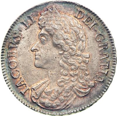 Great Britain. Crown, 1687. S-3407. James II, 1685-1688. Second Bust. Laureate, draped and cuirassed bust left. Reverse: Crowned cruciform arms, Garter star at center. TERTIO edge date. The flan exceptionally nice and the strike better than usual, albeit there is a touch of softness in the king's portrait, more due to die wear rather than strike. Overall, the centers are well defined and the reverse exceptionally sharp. Excellent eye appeal thanks to strong luster and bright amber-gold or pinkish iridescent toning in the recesses, which simply sparkles against the deeper gray fields. NGC graded MS-62.