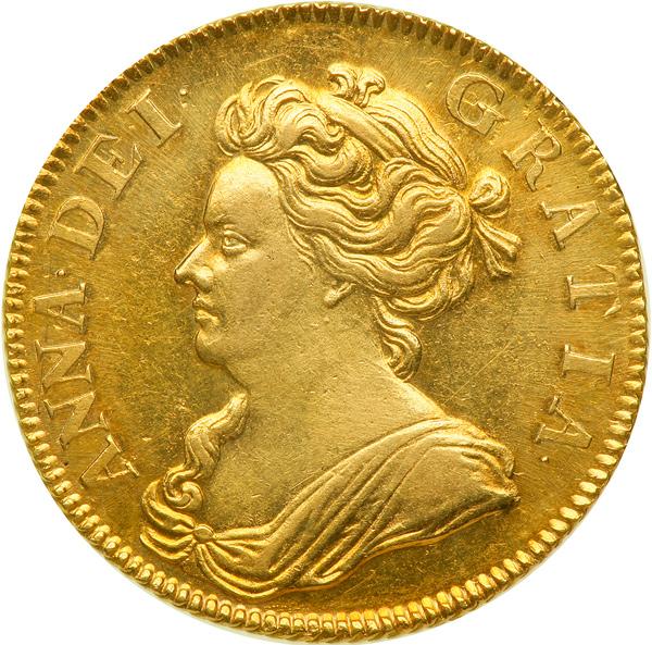 Great Britain. Guinea, 1702. S-3562; Fr-320; KM-511.1. Queen Anne, 1702-1714. Pre-Union reverse style. Draped bust left. Reverse: Crowned cruciform arms, with alternating scepters at angles, rose at center. Extremely rare as a type and also as a date in this grade: superb luster, slightly prooflike, boldly struck everywhere Believed by in-the-know dealers to be the finest Pre-Union guinea seen in the past 50 or more years. NGC graded MS-62.