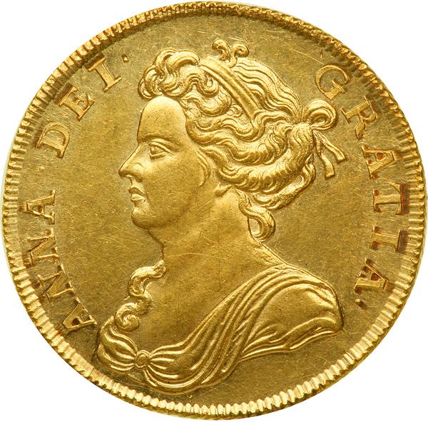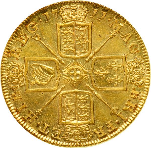 Great Britain. Two Guineas, 1711. S-3569; Fr-319. Queen Anne, 1702-1714. Post-Union; broad shields. Draped bust left. Reverse: Crowned cruciform arms, Garter star at center, sceptres in angles. A choice-looking guinea with a sharp strike, lustrous with considerable mint bloom and having especially mark-free surfaces for gold of this era. The queen's portrait is both sensitively drawn and sharply rendered. NGC graded MS-62.