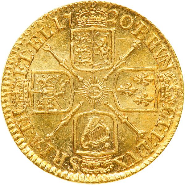 Great Britain. Guinea, 1720. S-3631; Fr-327; KM-546.1. George I, 1714-1727. Fourth Laureate Head, right. Reverse: Crowned cruciform arms, with alternating scepters at angles, Garter star at center. A delightful specimen, boldly struck, perfectly centered and highly lustrous. Exceptional eye appeal. NGC graded MS-62. .