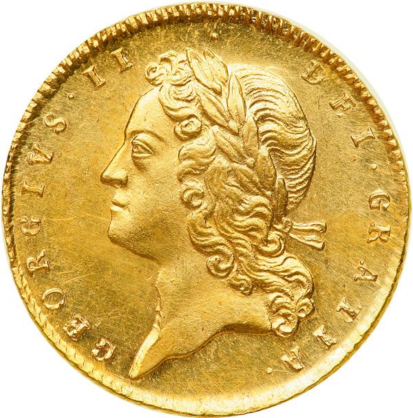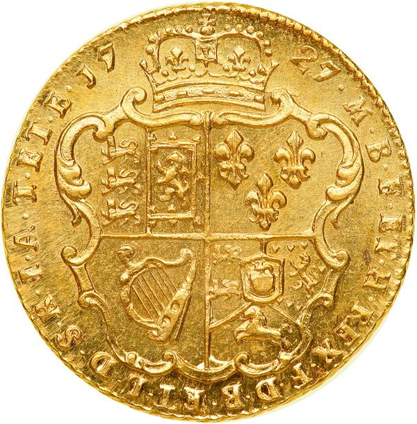 Great Britain. Guinea, 1727. S-3670; Fr-339; KM-562. George II, 1727-1760. First Young Laureate Head, left. Reverse: Crowned and garnished shield. First portrait variety, on larger flan with smaller lettering. A marvelously preserved, boldly struck and choice Uncirculated coin. Super rare in this condition, and one of the truly elusive gold coins of this king! NGC graded MS-62.