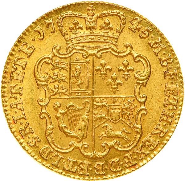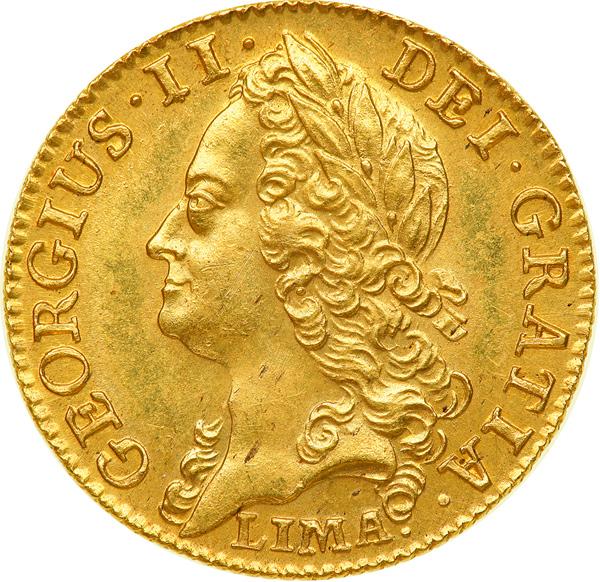 Great Britain. Guinea, 1745-Lima. S-3679; Fr-343; KM-577.4. George II, 1727-1760. Intermediate Laureate Head, left, below: LIMA. Reverse: Crowned and garnished shield. A very choice piece, sharply struck and exhibiting premium "green gold" toning. The rarity of this historic piece, in this grade, almost defies description. Probably the finest known. NGC graded MS-64. .