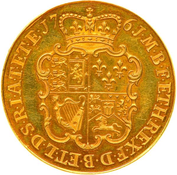 Great Britain. Pattern Guinea, 1761. WR-84. DM-97. George III, 1760-1820. Portrait by Yeo, the First Laureate Head, right (as adopted and used only in 1761). Plain edge. Reverse: Crowned and garnished shield. R4, very rare (11 to 20 known). This is among the rarest of all guinea types, and as a Proof it is even more special. In full brilliance, possessing lovely old-time reddish toning, moreso on its reverse. NGC graded Proof 63.