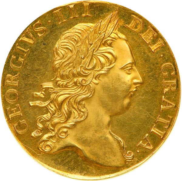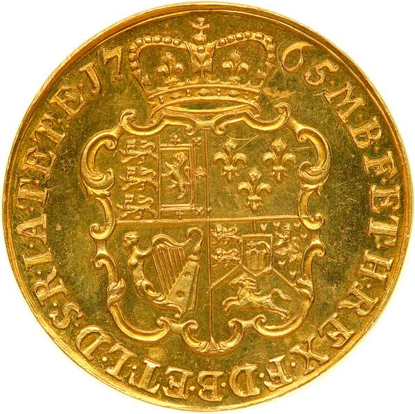 Great Britain. Proof Pattern Guinea, 1765. WR-88. DM-103 (this coin). George III, 1760-1820. Portrait by Yeo, the Intermediate Laureate Head, right. Reverse: Crowned and garnished shield. Plain edge. A brilliant and very choice specimen, with an impressive provenance. NGC graded Proof 64. .