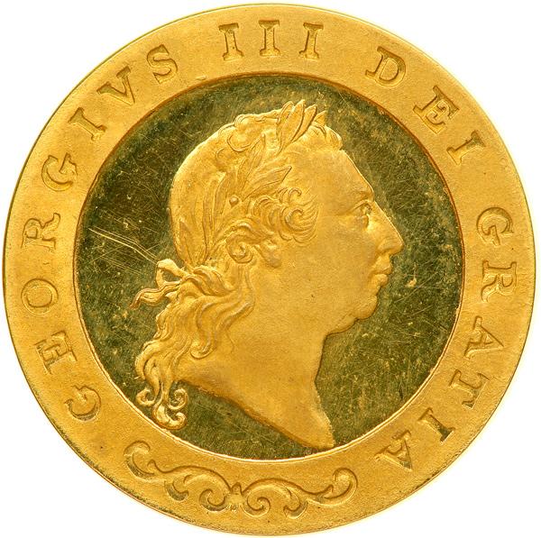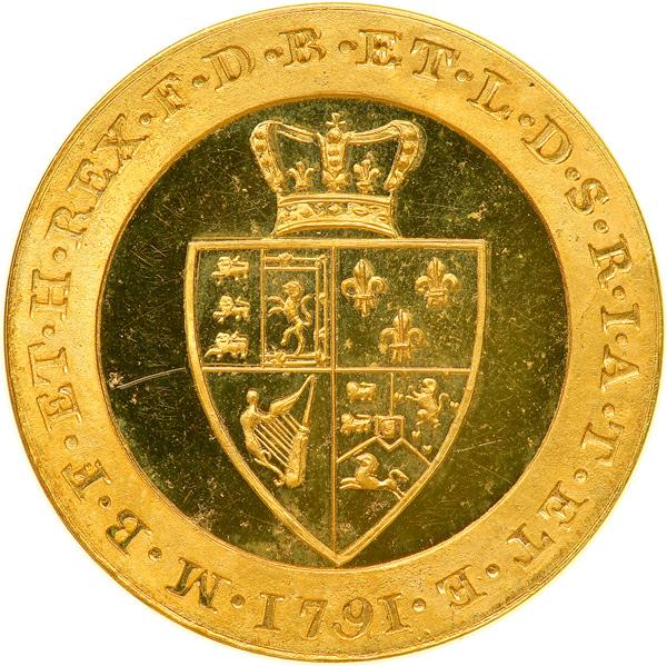 Great Britain. Pattern Guinea, 1791. WR-106. DM-114 (this coin). Struck in gold by Kuchler. George III, 1760-1820. Diminutive cameo portrait, set amid a mirror field offset by broad and heavily frosted borders inscripted with the legend. Reverse: Crowned, spade-shaped shield inside a similar broad border. Plain edge, thicker flan than normally used; struck using en medaille die alignment. R6: exceedingly rare: only a few (3 to 5) known in gold (some gilt also known). A marvelous, Choice brilliant Proof, with glossy fields and deeply frosted cameo devices and borders. NGC graded Proof 64 Ultra Cameo.