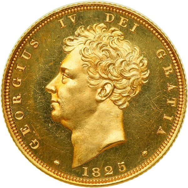 Great Britain. Pattern Sovereign, 1825. WR-236. By William Wyon after Chantrey's model. The reverse by Merlen. George IV, 1820-1830. Bare head left. Reverse: Crowned, ornately garnished shield. Reeded edge. R5, extremely rare (6 to 10 known). A choice specimen, with light golden toning and a nicely frosted portrait and shield. NGC graded Proof 64 Cameo. .