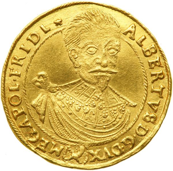 Bohemia (Wallenstein). Ducat, 1631. Fr-145; KM-61. 3.70 grams. 21.94 mm. Albert Wallenstein (Duke of Friedland and Sagan), 1625-1634. Front large facing armored and draped bust in beaded circle broken at the top. Reverse: Crowned complex arms. Very Rare. NGC graded MS-62. .