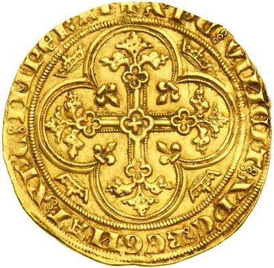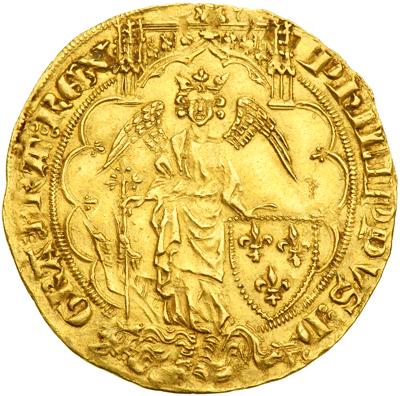 Hammered gold coins were issued by France for over 300 years, ending with the reign of Louis XIII. During this entire period only in 1341 was this type issued with a standing Archangel Michael. A major rarity, historically and symbolically important.