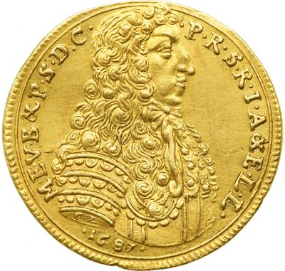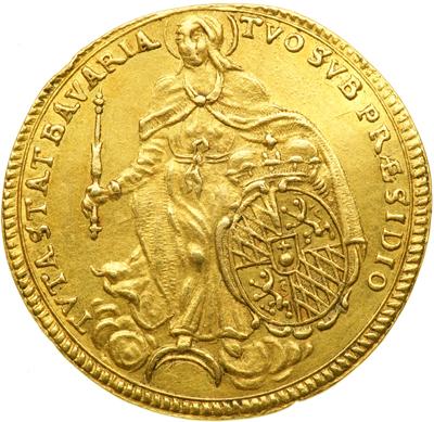 Bavaria. Ducat, 1687. Fr-217; KM-115. 3.46 grams. 21.58 mm. Maximilian II, Emanuel, 1679-1726. Armor bust of Elector right, date below bust, CZ (Caspar Zeggin) on shoulder. Leg: M.E.V.B.& S.D.C. - P.R.S.R.I.A & E.L.L. Reverse Madonna standing, scepter in right hand, crowned overal shield in left. Leg: TVTA.STA.T.BAVARIA - TVO SVB PRESIDIO. Very Rare. NGC graded AU-58.