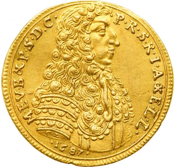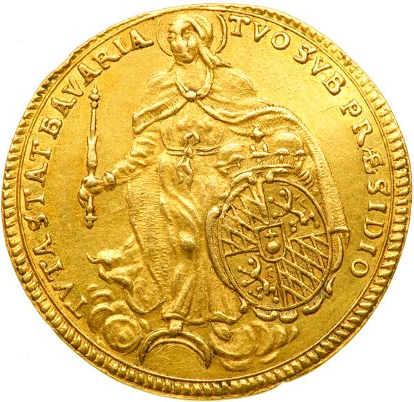 Bavaria. Ducat, 1687. Fr-217; KM-115. 3.46 grams. 21.58 mm. Maximilian II, Emanuel, 1679-1726. Armor bust of Elector right, date below bust, CZ (Caspar Zeggin) on shoulder. Leg: M.E.V.B.& S.D.C. - P.R.S.R.I.A & E.L.L. Reverse Madonna standing, scepter in right hand, crowned overal shield in left. Leg: TVTA.STA.T.BAVARIA - TVO SVB PRESIDIO. Very Rare. NGC graded AU-58. .