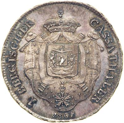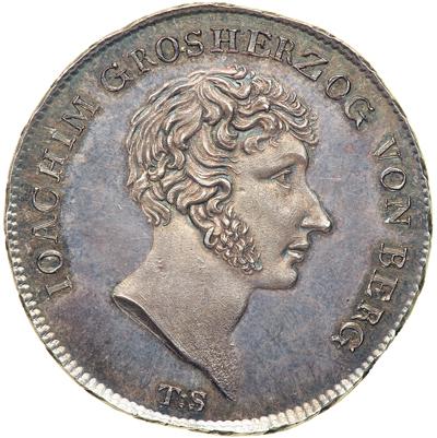 German States -- Berg. Cassa Taler, 1807 (Düsseldorf). Dav-625; Th-111; J-171. 18.89 grams. Joachim Murat, 1806-1808. Head right. Reverse: Crowned and mantled arms. Marvelous portrait! Superb blue-gray toning. Rare. NGC graded MS-64 Prooflike.