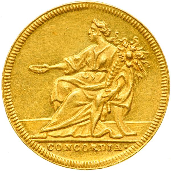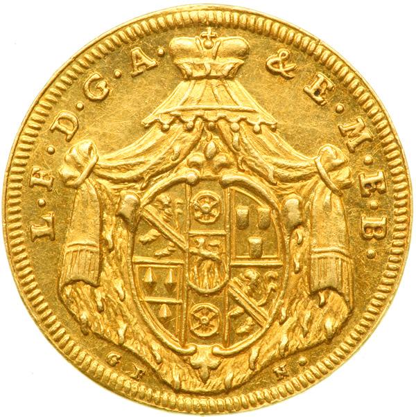 Mainz. Ducat, ND (1696). Fr-1666; KM-220. 3.50 grams. 20.76 mm. Mintmaster initials, GFN (Geog Friedrich Nurnberger, in Nuremberg). Lothar Franc, 1695-1729. On the Peace of Ryswick. Concordia seated with corucopia in left arm, crown or wreath of victory in right extened arm. Under figure "CONCORDIA" Reverse Arms under canopy. Leg: L.F.D.G.A - &E.M.E.B. NGC graded MS-61. .