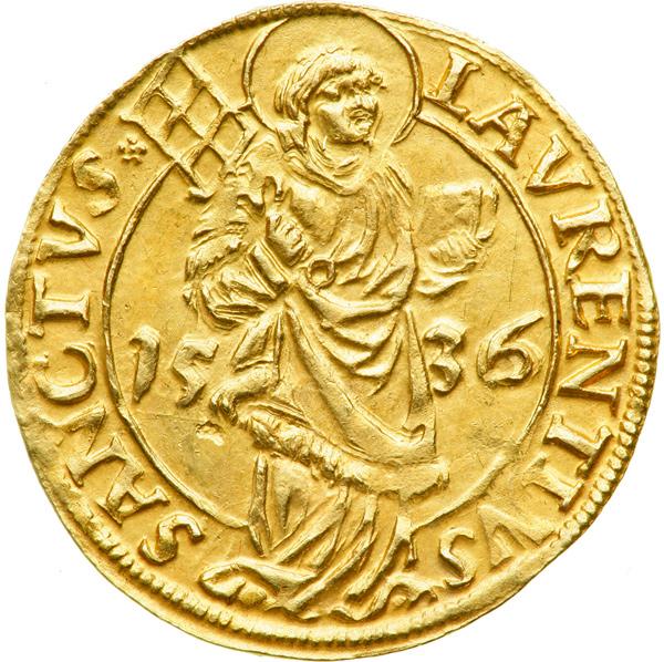 Nuremberg. Goldgulden, 1536. Fr-1801; Kellner-12. 3.21 Grams. 24.03 mm. Saint Lawrence with halo, head and feet breaking legend at top and bottom. Book in left and right holding grate over shoulder. Leg: SANCTVS* - LAVRENTIVS -. Date in field on either side of saint. Reverse Eagle left breaking inner circle. Leg: NVRENBERG* - MONE*REIPVB. Boldly struck with considerable mint luster. NGC graded AU-55.