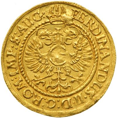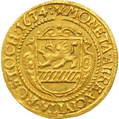 Rostock. Ducat, 1634. Fr-2587. 3.47 grams. 22.21 mm. In the name of Ferdinand II, 1618-1637. Obv. Arms. Griffin within elaborate cartouche within inner circle. Leg: MONETA.AUREA.CIVITA:ROSTOCH: 1634. Reverse Double headed eagle within inner circle, crown above. Leg: FERDINANDUS .II.D:G:ROM:IMP:S:AUG: NGC graded MS-63.