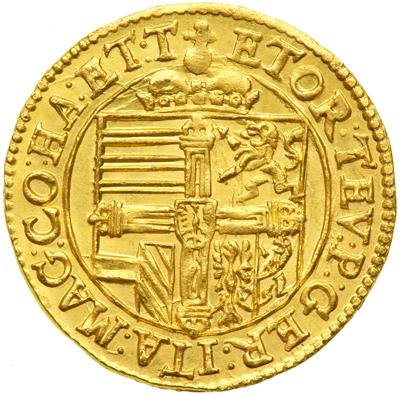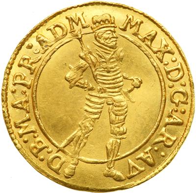 Teutonic Order. Ducat, ND. Fr-3379. 3.46 grams. 21.73 mm. Maximilian of Austria, 1590-1618. Obv. Archduke standing right; left hand on sword hilt and right hand on scepter. Leg: MAX:D:G:AR:AV - D:B:MA:PR.ADM Reverse Crowned complex arms on shield. Leg: Orb+ ETOR:TEV:P:GER:ITA:MAG:CO:HA:ET:T A lovely well struck, mint fresh coin. NGC graded MS-63.