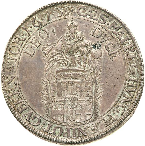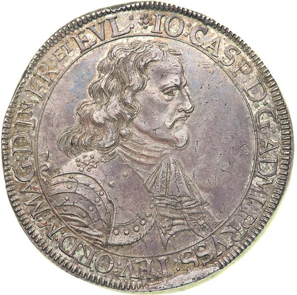 German States -- Teutonic Order. 2 Talers, 1673. Dav-5860. 57.5 grams. Johann Kaspar II von Ampringen, 1664-1684. Bearded and cuirassed bust right. Reverse: Madonna and child, crowned and holding scepter and globus cruciger, above crowned arms with DEO - DVCE separting. Very bold strike for issue, with with some minor doubling -- seen mostly along one axis. Fine original, old gray toning. Handsome portrait. Very rare. NGC graded AU-58. .