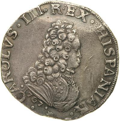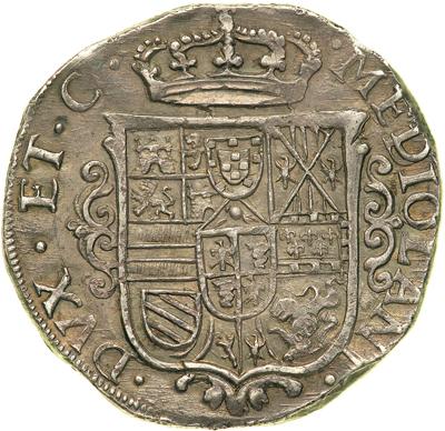 Italian States -- Milan, Filippo, 1707. Dav-1380. 27.75 grams. Archduke Charles, as Charles III, Pretender to the Throne of Spain, 1707-1711. Draped and cuirassed bust right, with elaborately curled hair. Reverse: Crowned Bourbon arms of Spain. A very fine example of this frequently crude issue. Handsome old toning, lightly iridescent on reverse. NGC graded AU-58.