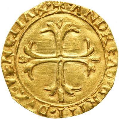 Venice. Scudo d'oro, ND. Fr-1448; CNI VII pl.IX,16. 3.02 grams. 23.50 mm. Andrea Gritti, 1523-1539. Obv: Large cross. Leg: +ANDREAVS. GRITI.DVX.VENETIV& Reverse Lion in shield. Leg: +.SANCTVS. MARCVS.VENETVS. NGC graded AU-58.