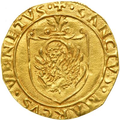 Scudo d'oro types are far scarcer than the zecchinos. Note the mention of St. Mark, patron saint of Venice.