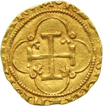 Spain. 1 Escudo De'Oro, ND. Fr-153. 3.36 grams. 21.51 mm. Carlos I and Juana, 1516-1556. Obv: Crowned arms, with S to right for Seville and symbol to left. Reverse Jerusalem cross within quadrefoil, mintmark tower. Struck on small flan, legends partly visible. NGC graded AU-55.
