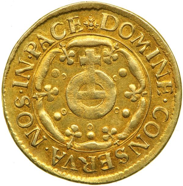Basel. Goldgulden ND (c.1644). Fr-25a variant. City coinage. 3.24 grams. 22.80 mm. Obv: Arms without leaf decoration, within adorned cartouche. Reverse Cross and orb within a more decortated hexafoil. Beautifully toned. Rare. NGC graded AU-58.