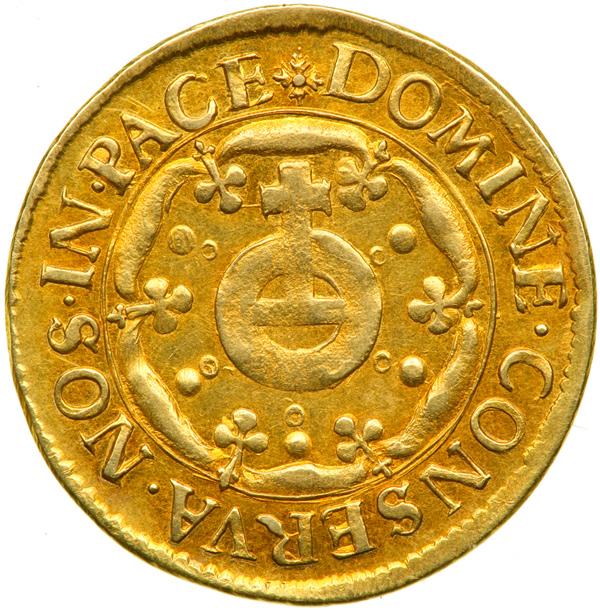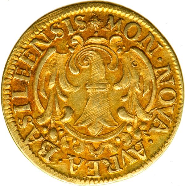 Basel. Goldgulden ND (c.1644). Fr-25a variant. City coinage. 3.24 grams. 22.80 mm. Obv: Arms without leaf decoration, within adorned cartouche. Leg: + MON.NOVA.AVREA.BASILEENSIS. Reverse Cross and orb within a more decortated hexafoil. Leg: (star) DOMINE.CONSERVA.NOS.IN.PACE. Rare. NGC graded AU-58.